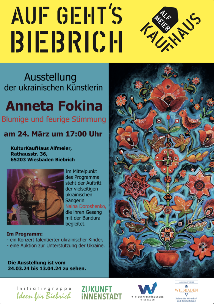 Ausstellung der ukrainischen Künstlerin Anneta Fokina Blumige und feurige Stimmung am 24. März um 17:00 Uhr KulturKaufHaus Alfmeier, Rathausstr. 43, 65203, Wiesbaden Biebrich •Im Mittelpunkt des Programms steht der Auftritt der vielseitigen ukrainischen Sängerin Naina Doroshenko, die ihren Gesang mit der Bandura begleitet. Im Programm: ein Konzert talentierter ukrainischer Kinder, eine Auktion zur Unterstützung der […]